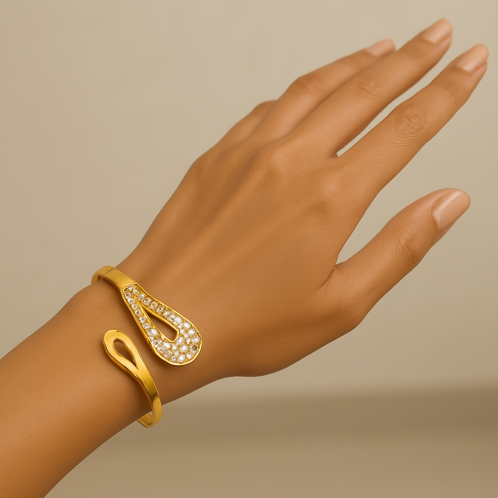 Make a modern statement with this unique open circle bracelet. The sleek design features a delicate circle shape, adorned with sparkling stones. This bracelet adds a touch of contemporary elegance to any look.