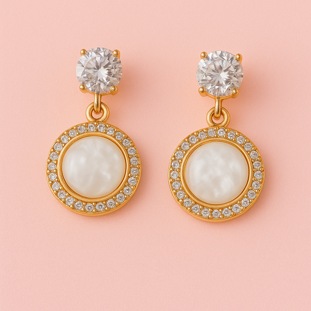 Timeless beauty meets refined sparkle in these round drop earrings. Featuring a luminous pearl-like center surrounded by radiant crystals, these earrings are perfect for adding a classy finishing touch to any ensemble.
