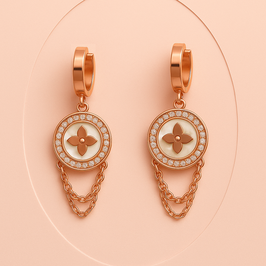 Inspired by delicate florals, the Fleur Charm Earrings showcase a luminous mother-of-pearl backdrop and a signature flower design framed with pavé brilliance. Double chain details add a graceful touch, while the anti-tarnish finish ensures lasting beauty.