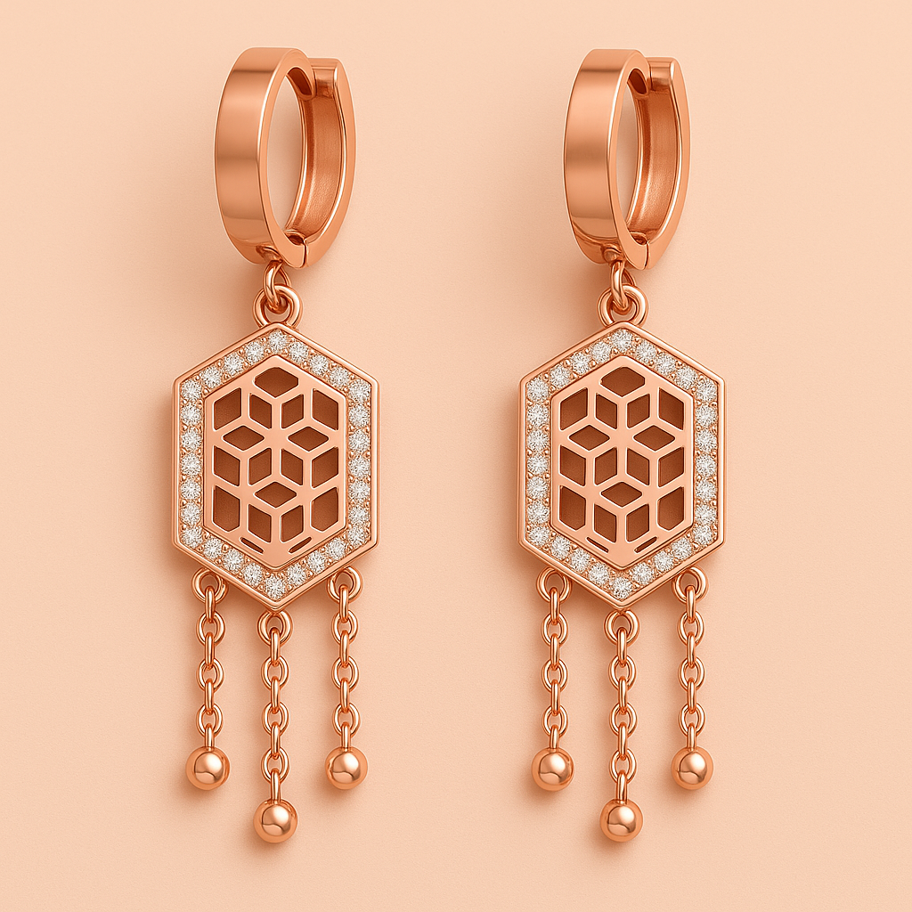 Elegant anti-tarnish earrings featuring a hexagonal lattice design with crystal accents and triple chain drops for a modern, stylish look.