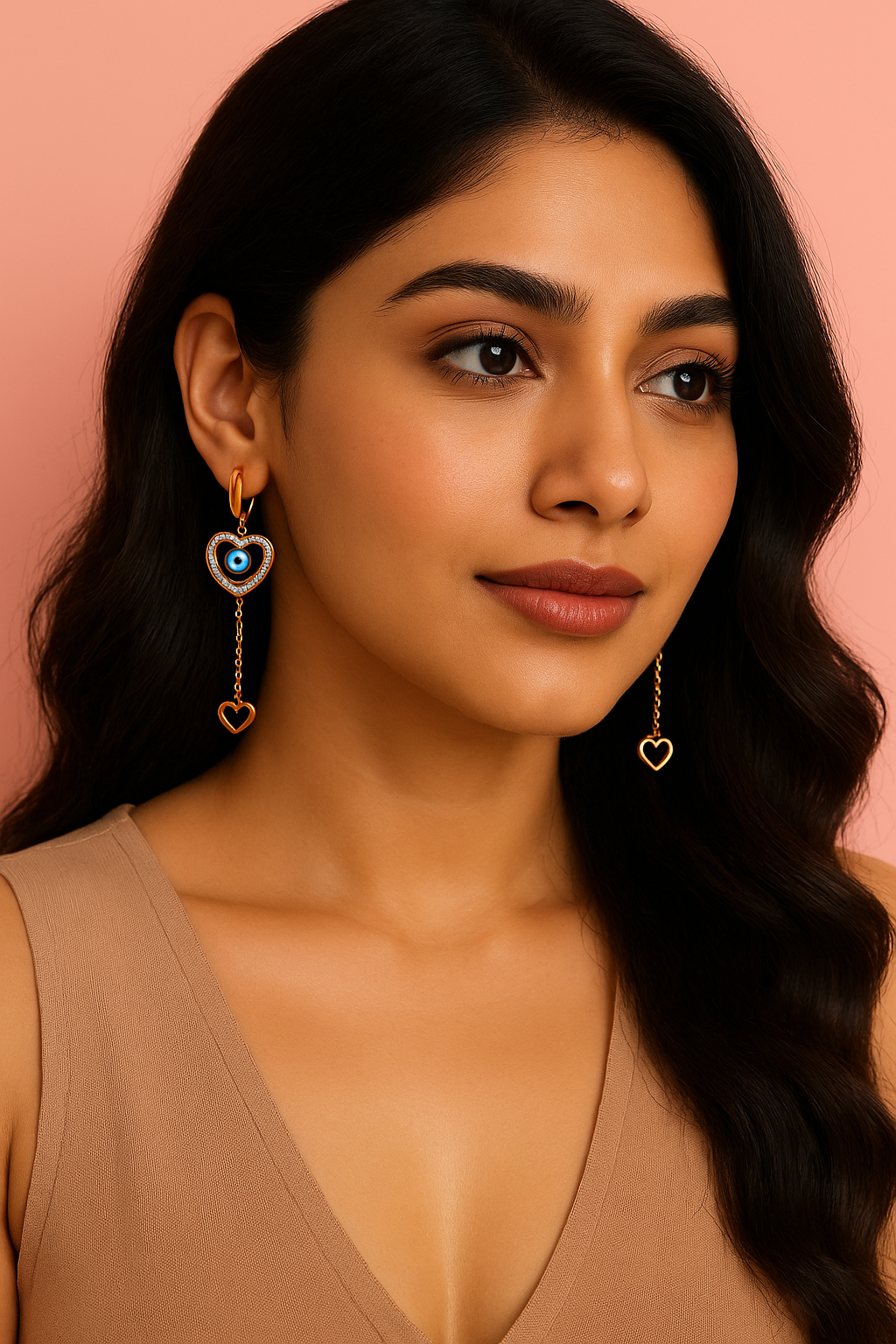 Protect your aura in style with these elegant Evil Eye Heart Chain Earrings. Featuring sparkling crystals, a symbolic evil eye centerpiece, and delicate dangling hearts, all crafted with an anti-tarnish finish for long-lasting shine. Lightweight and perfect for everyday wear or special occasions.