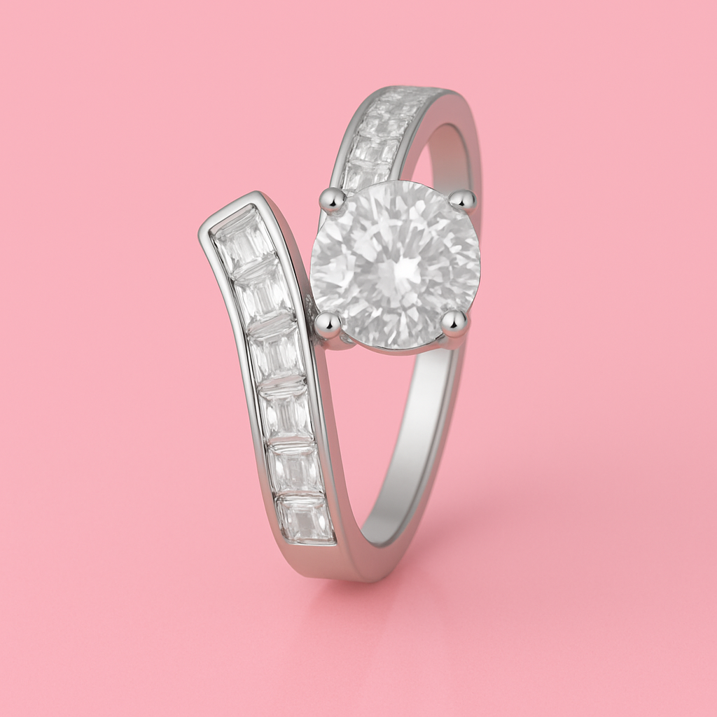This eye-catching ring features a bold solitaire centerpiece framed by a unique dual-band design. One band is lined with rectangular-cut stones, while the other showcases a delicate row of shimmering accents. A perfect fusion of elegance and modern style, this ring is ideal for making a lasting impression at any event.